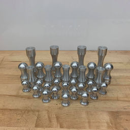 In order to produce multiple pieces of each type, the manufacturing process was streamlined. The base profile of each piece was turned on a HAAS TL-1 Lathe. They were then modified further on manual ProtoTRAK mills or the 3-axis HAAS Minimill, with the help of SolidCAM to create asymmetric features. Half of these aluminum bases were anodized black to differentiate between teams. In addition, every piece, other than the pawns, had independently machined bronze inserts.